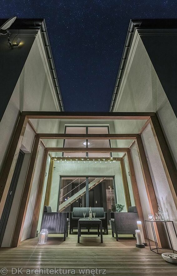 Budynek o nowoczesnej bryle, z dużymi przeszkleniami, wykonany z pustaka ceramicznego, ocieplony i otynkowany, dach kryty blachą